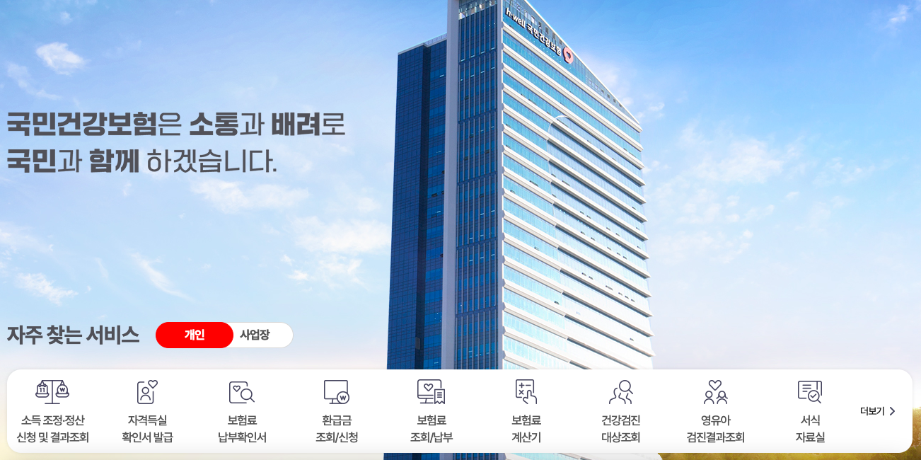 - 국민건강보험공단 홈페이지 접속 : 국민건강보험공단 홈페이지로 이동합니다.