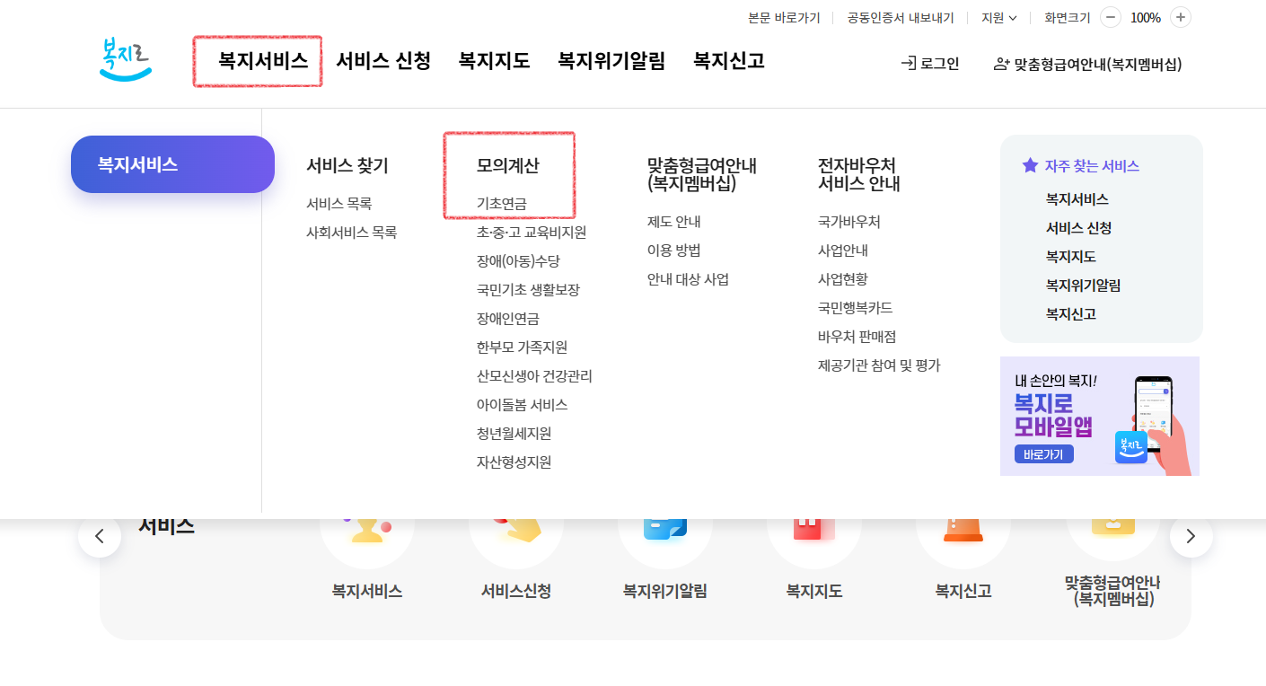 ① 복지로(https://www.bokjiro.go.kr/ssis-tbu/index.do) 홈페이지에서 복지서비스모의계산 기초연금 클릭