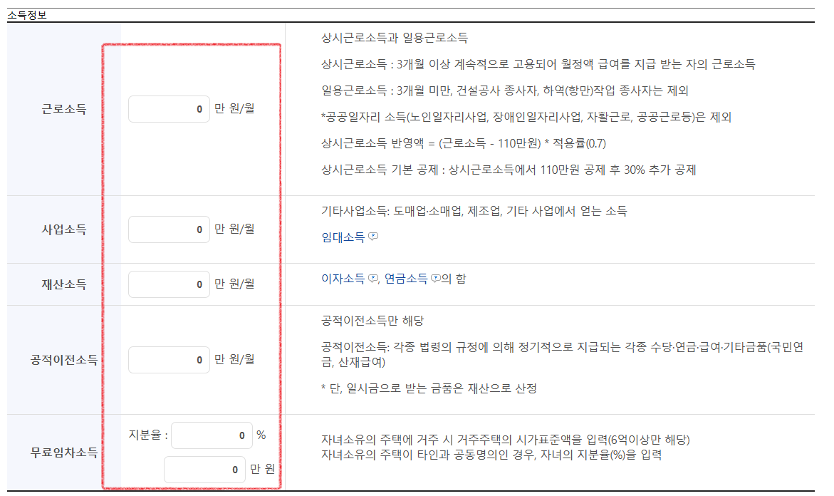④ 소득정보근로소득, 사업소득, 재산소득, 공적이전소득, 무료임차소득을 입력합니다.