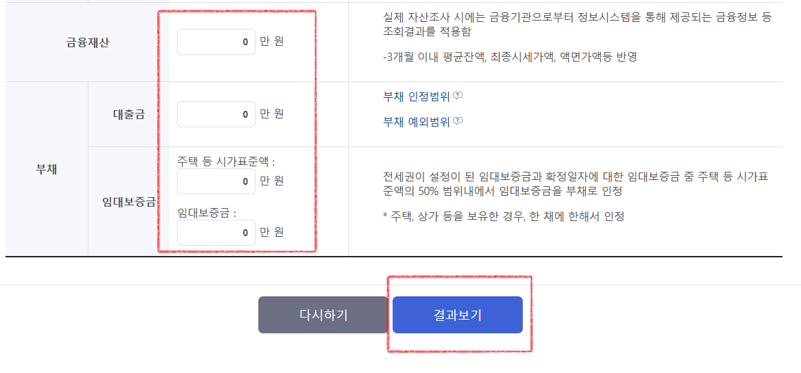 ⑥ 재산정보금융재산부채 내용을 입력 후 결과보기를 클릭합니다.