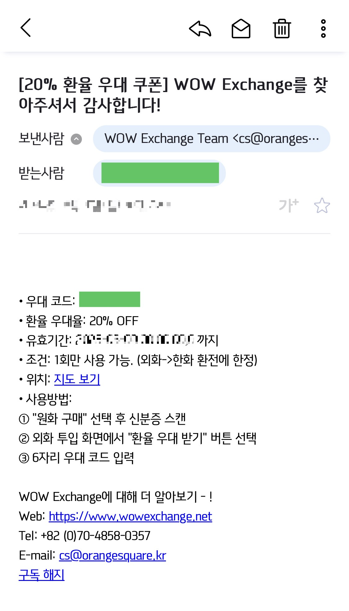 ④ 등록했던 이메일에 20% 우대쿠폰이 도착한 걸 확인하실 수 있습니다. 그런데 이건 와우익스체이지 구독인 듯한데, 불편하시면 발송된 내용에 구독해지 이메일 정보도 함께 있으신 해시 신청하시면 될 것 같습니다.