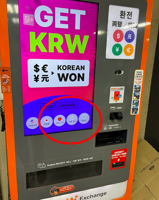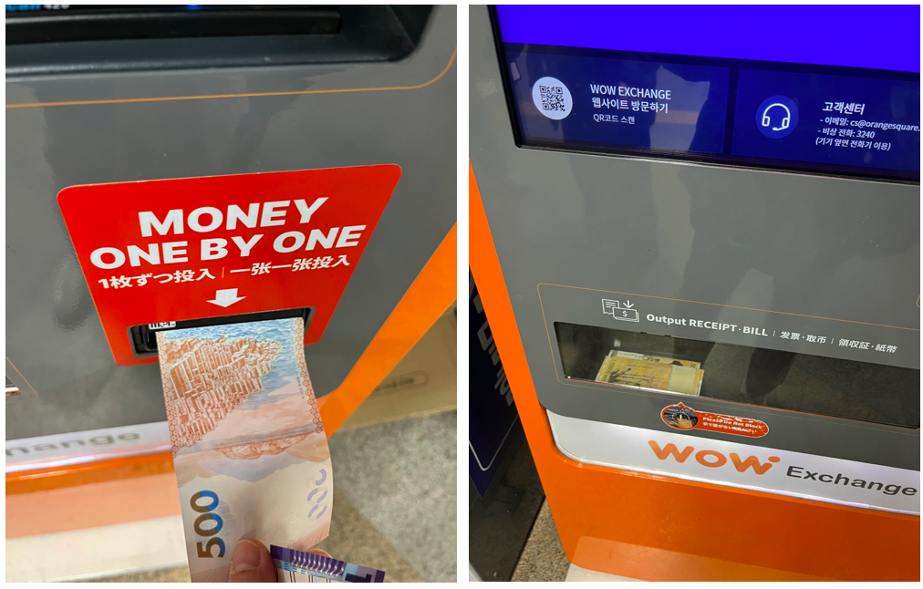 ⑩ 무인환전기 우측 하단 'MONEY ONE BY ONE'에 외환을 투입하면, 좌측하단 'Output RECEIPT·BILL'에서 환전된 원화가 인출됩니다.