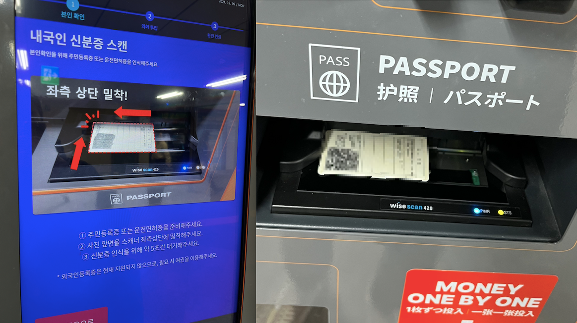 ⑦ 내국인 신분증 스캔 안내에 따라 기기 우측하단 'PASSPORT'에 신분증을 놓으면 자동으로 스캔이 됩니다.