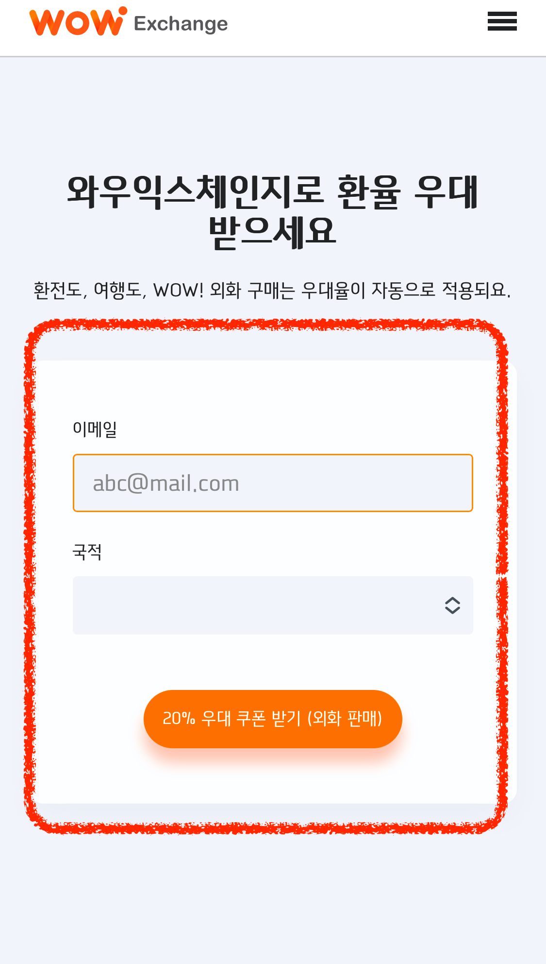 ③ 본인의 이메일과 국적을 입력하고 '20% 우대 쿠폰 받기(외환 판매)'를 선택합니다.