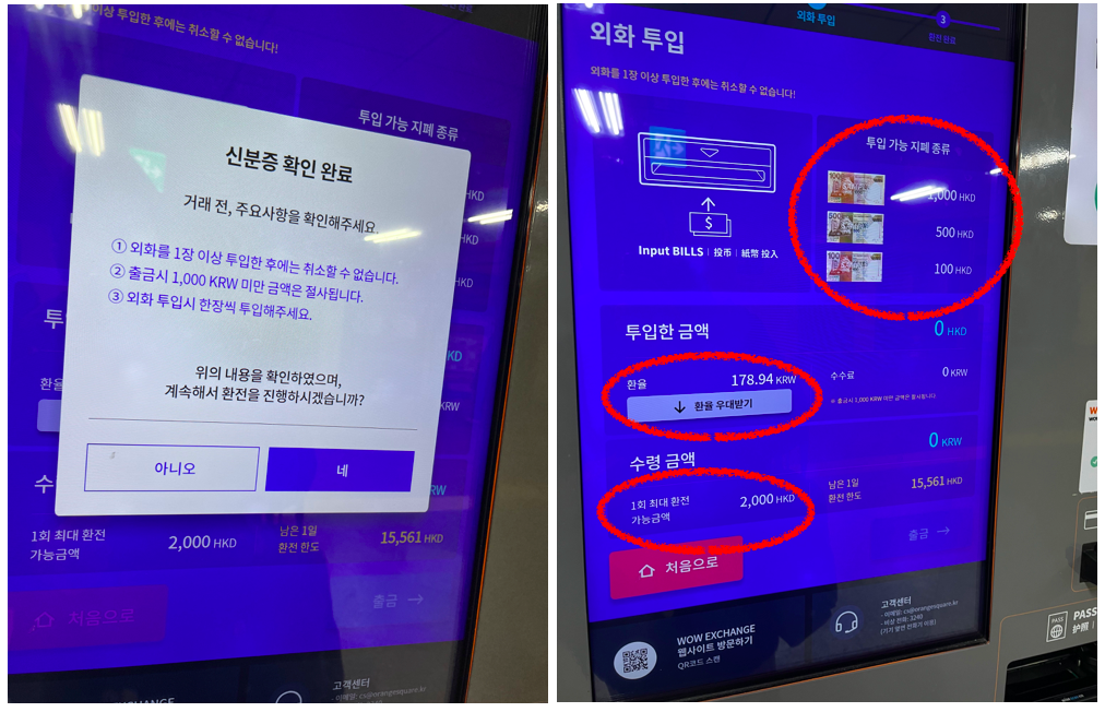 ⑧ 신분증 확인이 완료되면 아래 내용과 같이 주요 확인사항이 나타납니다. 1) 외환 투입 후 취소 불가, 2) 출금 시 1,000원 미만 절삭, 3) 한 장씩 투입이니 이점 꼭 확인하시기 바랍니다. 확인 후 '네' 버튼을 누르시면 투입가능한 외환과 1일 최대 거래 가능금액 확인 하시고, '환율 우대받기'를 선택합니다.(환율우대 코드 받는 방법은 위내용을 확인 바랍니다, 혹 환율우대를 받지 못하였다면 이 절차는 패스)
