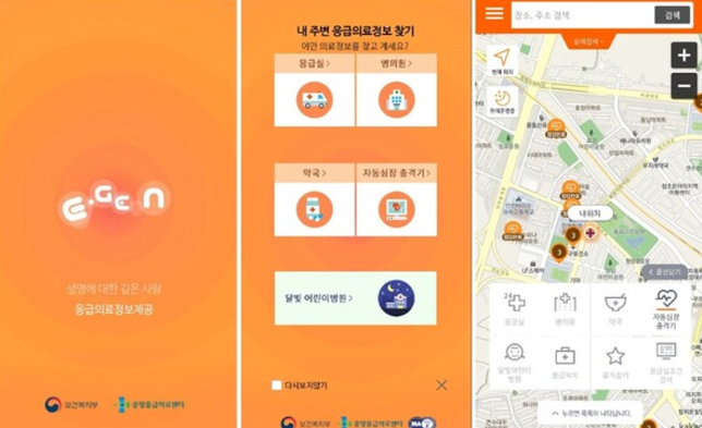 응급의료 정보를 제공하는 E-GEN 앱을 사용하시면 사용자의 위치 정보를 통해 진료받을 수 있는 병의원과 약국의 위치를 찾을 수 있습니다. 지도를 통해 응급실, 병의원, 약국, 달빛어린이병원의 위치를 쉽게 찾을 수 있고, 그 외 자동심장충격기(AED)의 위치와 응급처치요령 등의 정보도 얻을 수 있습니다.