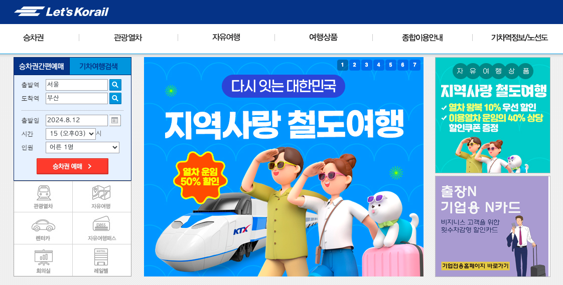 - 2024년 8월 22일(목, 7:00~13:00) : 일반고객을 대상으로 홈페이지(PC, 모바일)에서 호남﹒ 전라﹒ 강릉﹒ 장항﹒ 중앙﹒ 태백﹒ 영동﹒ 경춘선 노선을 대상으로 진행됩니다.