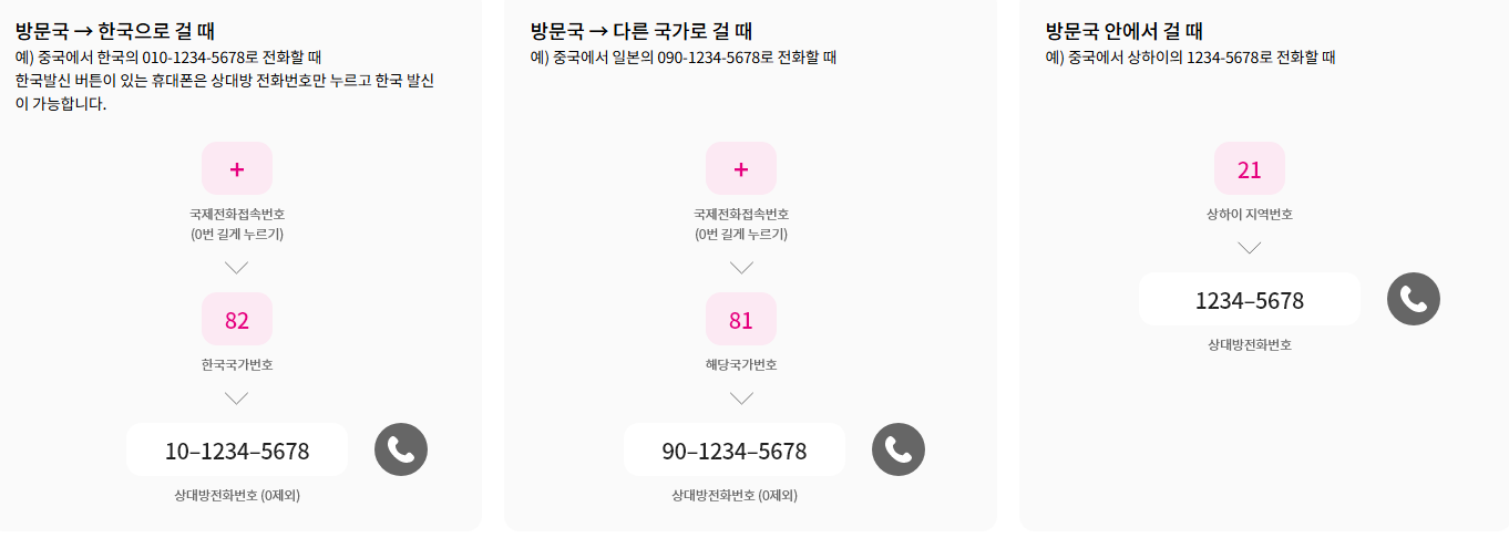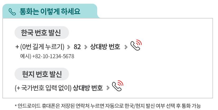 현지에서 통화를 하실 때 한국 번호로 발신하실 때는 '+(0번 길게 누르기)→82 →상대방번호 →통화버튼' 순으로 하시면 되고, 현지 번호로 발신하실 때는 상대방 번호로 바로 통화사히면 됩니다.