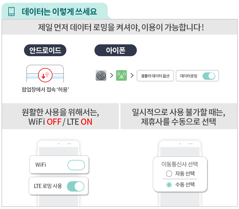 데이터 이용 시에는 제일 먼저 데이터 로밍을 활성화시켜야 이용이 가능하니 꼭 확인하시기 바랍니다.
