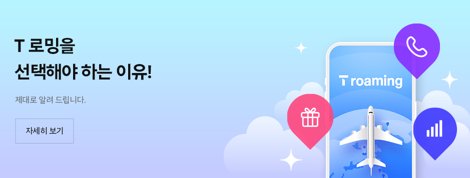 SKT의 로밍 서비스는 따로 신청하지 않아도 해외에서 내 스마트폰과 전화번호를 그대로 사용할 수 있는 서비스입니다. 로밍 맞춤조회와 요금제 상품은 SKT 고객센터, 공식 웹사이트와 모바일 앱에서도 간편하게 확인이 가능합니다. 또한 공항 등의 T로밍센터에서 안내받을 수 있습니다.