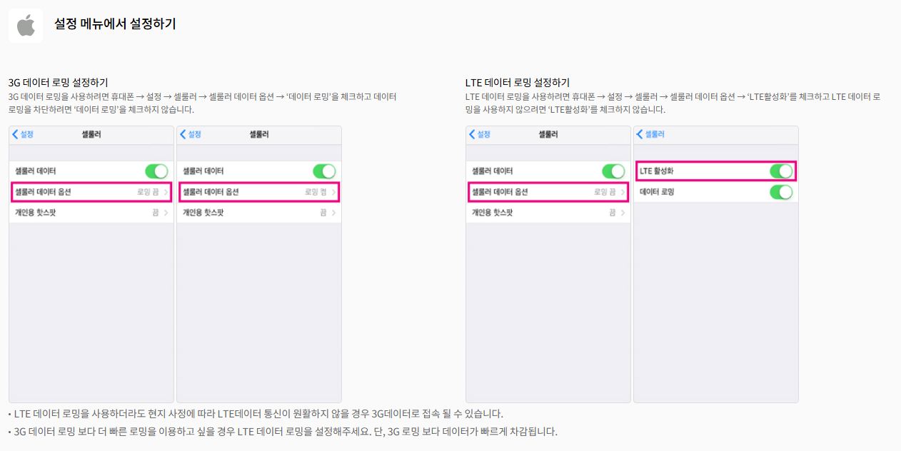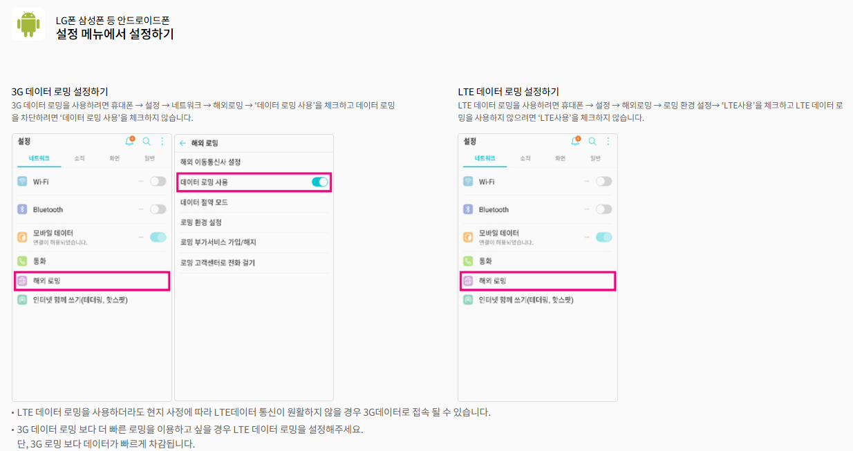 스마트폰에서 설정에서 LTE 우선 모드를 켜고 제휴된 통신사 망에 연결하시면 LTE 로밍이 설정이 됩니다. 단, 제휴 통신사의 사정에 따라 LTE 사용이 원활하지 않는 경우에는 3G로 연결됩니다.